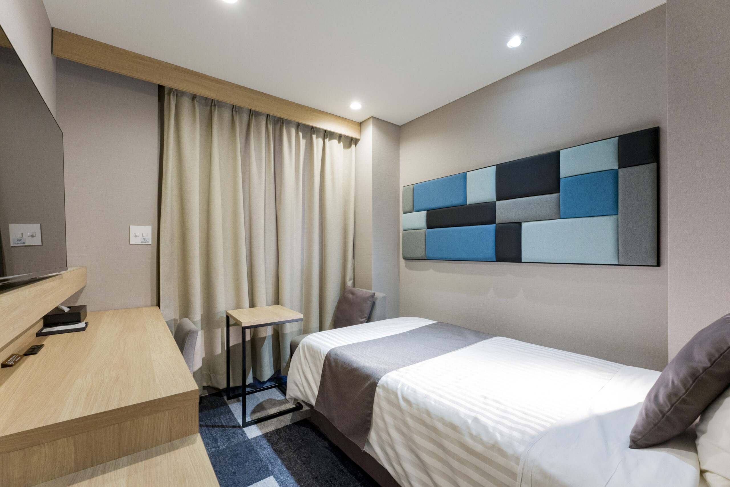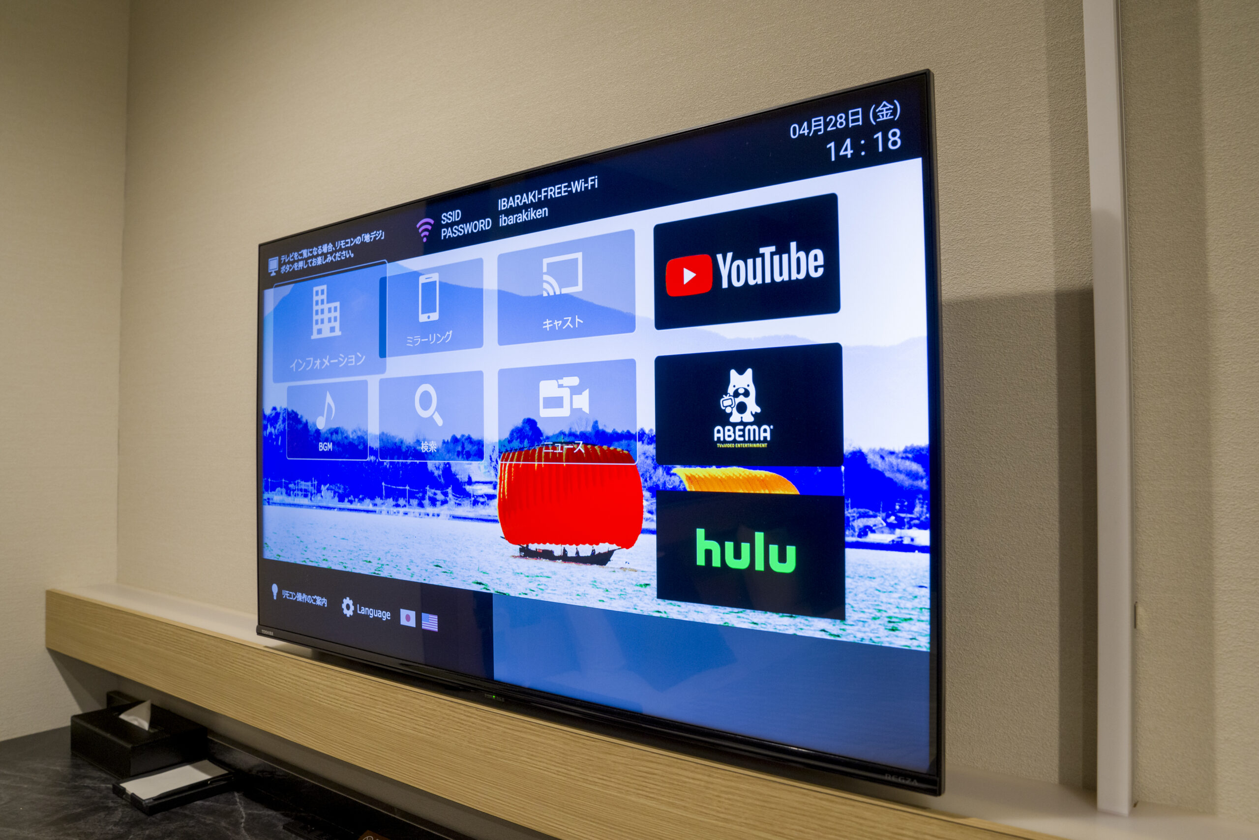 ウェブミーティングを遅延なく行うことができます。LANケーブルはデスク引き出しにございます。また全客室備え付けの43型4K液晶テレビは、パソコンの拡張ディスプレイとしても利用可能です。デスク天板内蔵のHDMI端子に接続し、テレビの入力を切り換えればOK。